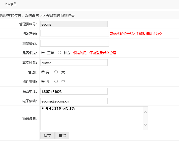 开发者账号(全功能后台): 用户名:eucms 密码:eucms