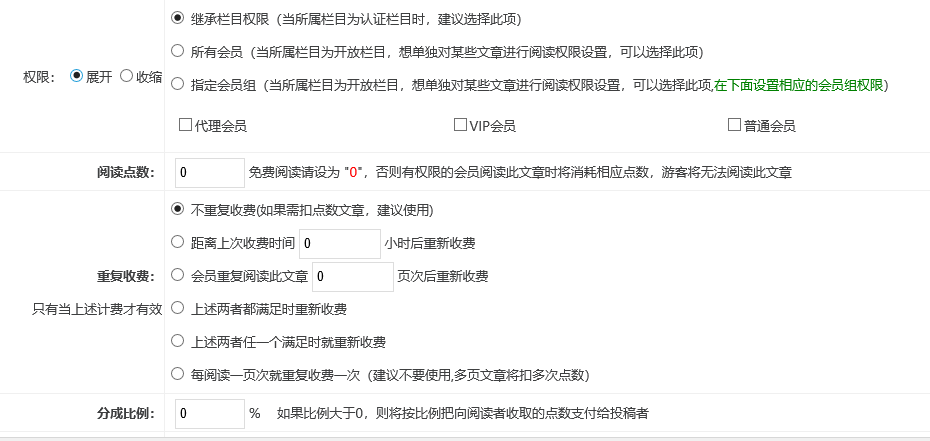 在此开户会员功能,开户会员注册,在下面设置比率,然后添加或修改信息在最下面可以看到阅读权限及扣费选项: